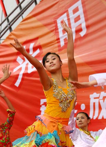 一名少女在光明食品節(jié)開(kāi)幕儀式上載歌載舞