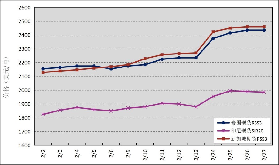 國外主產(chǎn)區(qū):2月,國外主產(chǎn)區(qū)價格呈上漲趨勢。其中,泰國3號煙片膠(RSS3)平均價格2253美元/噸,環(huán)比增加102美元/噸,最高價2435美元/噸,最低價2155美元/噸;印尼20號標準膠(SIR20)平均價格1902美元/噸,環(huán)比增加82美元/噸,最高價1995美元/噸,最低價1825美元/噸。