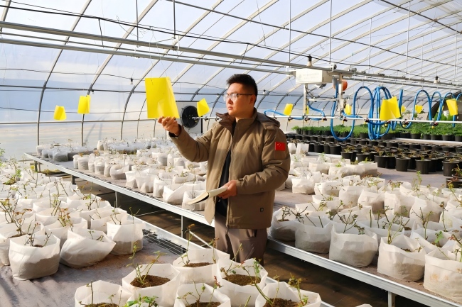 “冬季花苗生長(zhǎng)慢,枯枝敗葉會(huì)消耗養(yǎng)分,像月季我們會(huì)保留3—4根健壯主枝,斜口修剪能避免積水爛枝;清雜草不光是整潔,主要是防止雜草搶養(yǎng)分、帶病菌,這樣花苗開(kāi)春才能茁壯生長(zhǎng)?!痹诖笈锢?,技術(shù)員王斯達(dá)正在查看并記錄花苗長(zhǎng)勢(shì)情況。