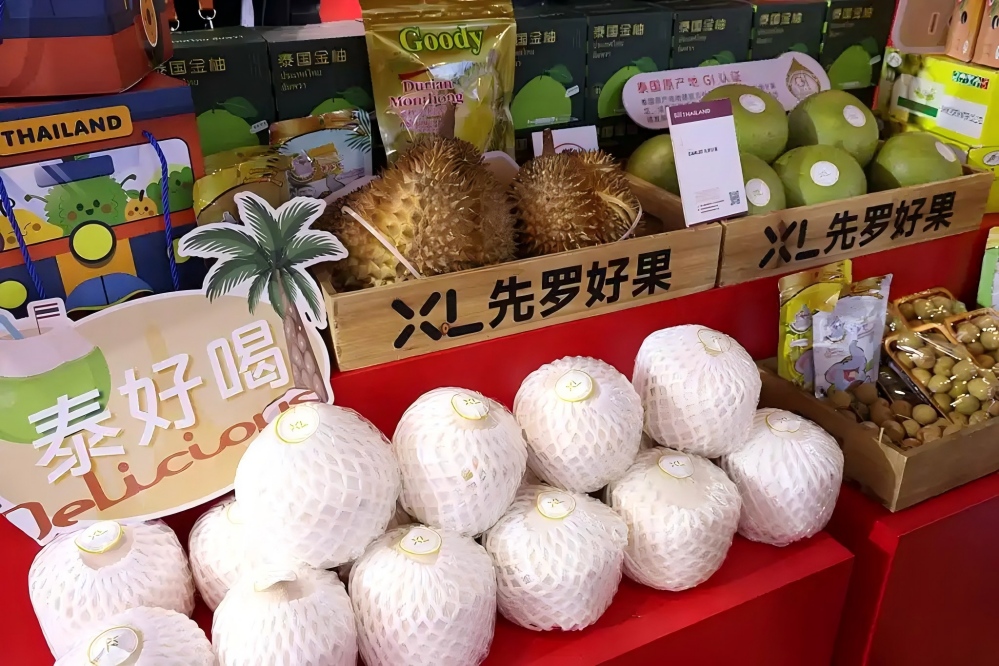 11月,在上海舉辦的第八屆中國國際進口博覽會上,泰國農(nóng)食產(chǎn)品企業(yè)館展出椰子、榴梿等多款水果。 (視覺中國)