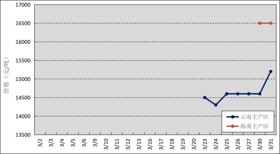 國內(nèi)主產(chǎn)區(qū):3月,國內(nèi)產(chǎn)區(qū)物候正常,下旬云南主產(chǎn)區(qū)進入試割期,月末海南主產(chǎn)區(qū)逐步開割,云南、海南鮮膠乳(折干膠)月均價格分別為14629元/噸、16500元/噸。