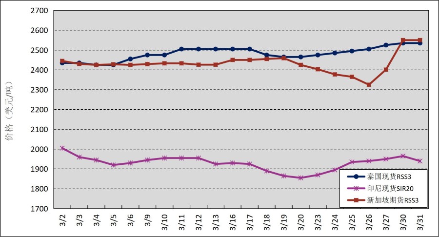 國外主產(chǎn)區(qū):3月,國外主產(chǎn)區(qū)價格呈小幅波動態(tài)勢。其中,泰國3號煙片膠(RSS3)平均價格2482美元/噸,環(huán)比增加229美元/噸,最高價2535美元/噸,最低價2425美元/噸;印尼20號標準膠(SIR20)平均價格1930美元/噸,環(huán)比增加28美元/噸,最高價2005美元/噸,最低價1855美元/噸。