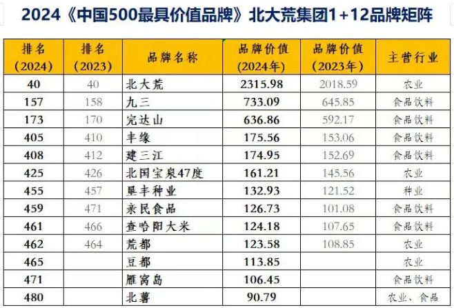 在這份基于財務(wù)數(shù)據(jù)、品牌強度和消費者行為分析的年度報告中,由九三糧油工業(yè)集團有限公司持有的“九三”品牌,品牌價值達733.09億元,排名第157位,較去年增長87.24億元。由北大荒完達山乳業(yè)股份有限公司持有的“完達山”品牌,品牌價值達636.86億元,排名第173位,較去年增長44.69億元。由北大荒豐緣集團有限公司持有的“豐緣”品牌,品牌價值達175.56億元,排名第405位。由建三江分公司持有的“建三江”品牌,品牌價值達174.95億元,排名第408位。由寶泉嶺分公司持有的“北國寶泉47度”品牌,品牌價值達161.21億元,排名第425位。由北大荒墾豐種業(yè)股份有限公司持有的“墾豐種業(yè)”品牌,品牌價值達132.93億元,排名第455位。由北大荒親民有機食品有限公司持有的“親民食品”品牌,品牌價值達126.73億元,排名第459位。由黑龍江查哈陽米業(yè)有限公司持有的“查哈陽大米”品牌,品牌價值達124.18億元,排名第461位。由牡丹江分公司持有的“荒都”品牌,品牌價值達123.58億元,排名第462位。由九三分公司持有的“豆都”品牌,品牌價值達113.85億元,排名第465位。由紅興隆分公司持有的“雁窩島”品牌,品牌價值達106.45億元,排名第471位。由北大荒薯業(yè)集團有限公司持有的“北薯”品牌,品牌價值達90.79億元,排名第480位。