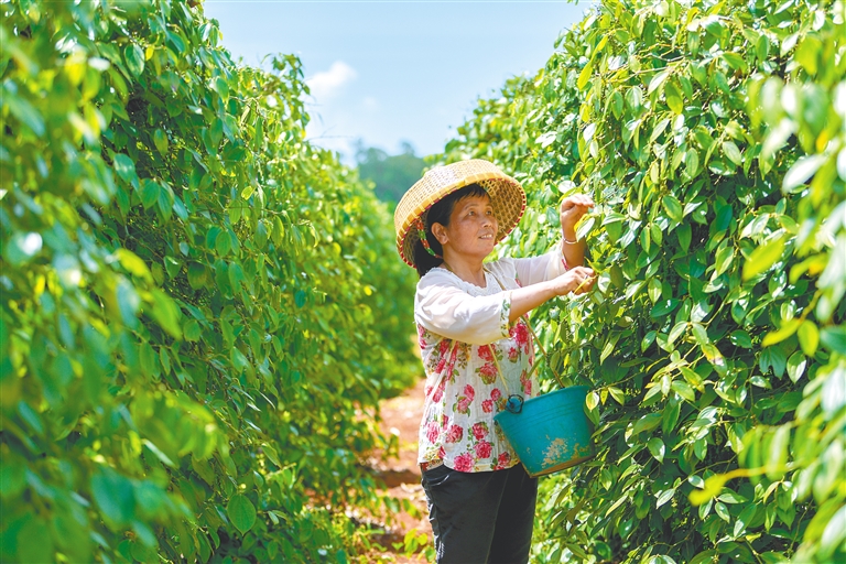 “現(xiàn)在是胡椒掛果期,每天一早,我就來(lái)采摘胡椒,直到中午才回家吃飯。”在種植基地里,黃麗貞是最早到達(dá)、最晚離開(kāi)的那批人之一。2015年,在公司工會(huì)幫扶下,她管起5畝地800株胡椒,如今每年能有三四萬(wàn)元收入。