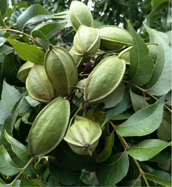 談起碧根果,常人字隨聲發(fā):“洋果”。因為“碧根果”是美國土著阿岡昆人的詞匯,意思是“用石頭才能砸碎的堅果”,學(xué)名薄殼山核桃,原產(chǎn)于北美,英文名為pecan,在中國被音譯為碧根果。中國山核桃與碧根果同科同屬不同組,為裸芽山核桃組。高大落葉喬木,因其果實呈橢圓形,有時候又被稱為長山核桃,市場上也稱之為美國山核桃。
