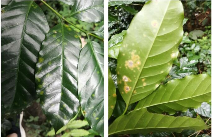 咖啡銹病為害癥狀(左葉片正面,右葉片背面)