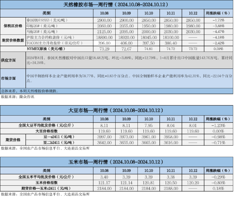 天然橡膠、大豆、玉米市場(chǎng)一周行情(2024.10.08-10.12)
