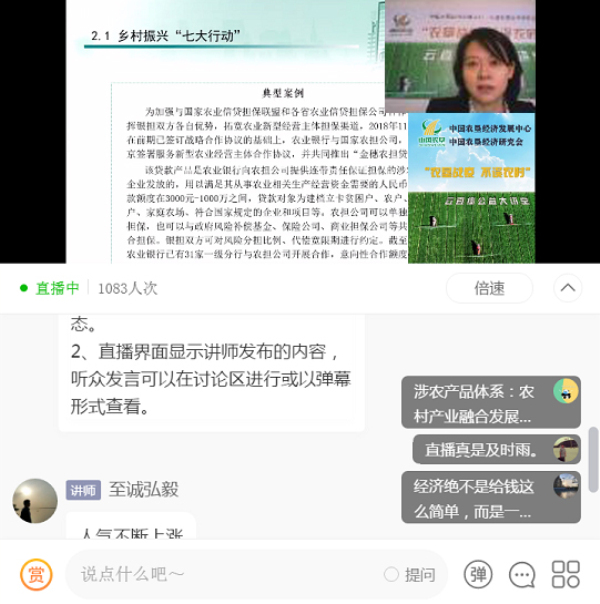 為貫徹落實(shí)中央關(guān)于統(tǒng)籌推進(jìn)新冠肺炎疫情防控和經(jīng)濟(jì)社會(huì)發(fā)展工作的部署要求,4月3日上午,由中國農(nóng)墾經(jīng)濟(jì)發(fā)展中心、中國農(nóng)墾經(jīng)濟(jì)研究會(huì)主辦的“農(nóng)墾戰(zhàn)疫 不誤農(nóng)時(shí)”云直播公益大講堂首場開講。直播由中國農(nóng)墾經(jīng)濟(jì)發(fā)展中心副主任、中國農(nóng)墾經(jīng)濟(jì)研究會(huì)秘書長陳忠毅主持,邀請(qǐng)中國農(nóng)業(yè)銀行總行三農(nóng)對(duì)公業(yè)務(wù)部農(nóng)業(yè)金融處處長何源源講授《“三農(nóng)”金融服務(wù)助力農(nóng)墾發(fā)展》,全國各墾區(qū)、農(nóng)場及相關(guān)單位人員1400余人在線觀看,反響熱烈,效果良好。