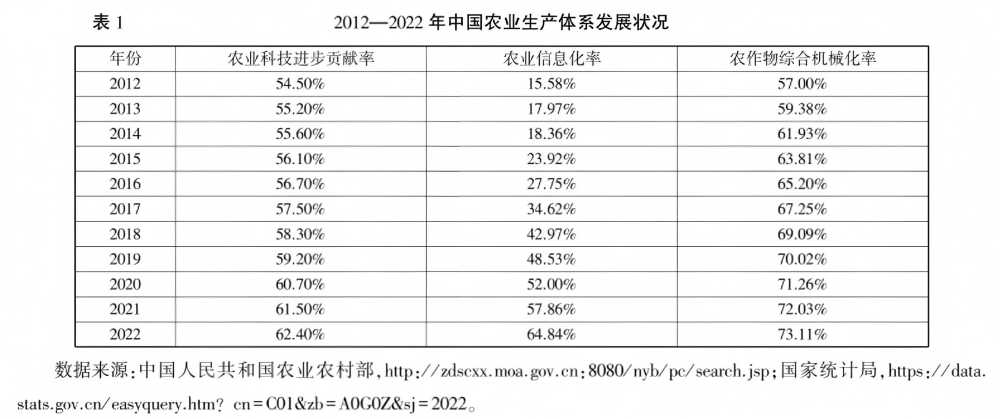 現(xiàn)代化農(nóng)業(yè)生產(chǎn)體系意味著先進(jìn)生產(chǎn)手段和生產(chǎn)技術(shù)的有機(jī)結(jié)合,重點解決的是農(nóng)業(yè)的發(fā)展動力和生產(chǎn)效率問題。構(gòu)建現(xiàn)代化農(nóng)業(yè)生產(chǎn)體系能夠使得一個國家的農(nóng)業(yè)生產(chǎn)率突破自然條件的限制,實現(xiàn)生產(chǎn)力的高效提升。考察現(xiàn)代化農(nóng)業(yè)生產(chǎn)體系建設(shè)情況,可以從農(nóng)業(yè)生產(chǎn)率、農(nóng)業(yè)科技貢獻(xiàn)率、農(nóng)業(yè)信息化率、農(nóng)業(yè)機(jī)械化率以及農(nóng)業(yè)資本有機(jī)構(gòu)成等幾個核心指標(biāo)出發(fā)。此外,生態(tài)可持續(xù)性也是生產(chǎn)發(fā)展的重要考量維度,本文此以農(nóng)藥化肥投入水平考察農(nóng)業(yè)生態(tài)發(fā)展情況。