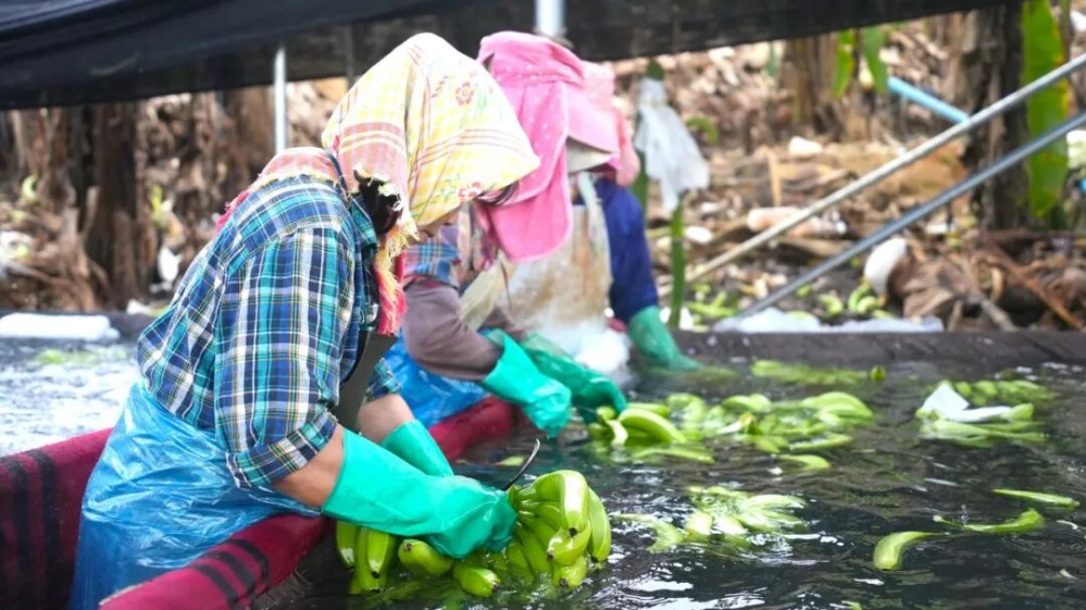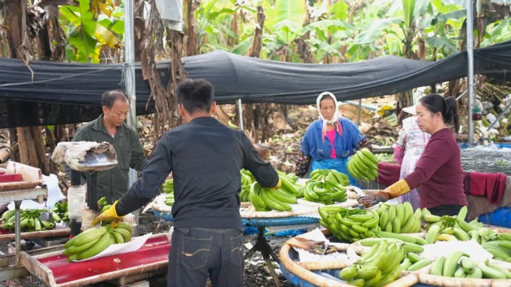 分揀大棚內(nèi),十余名工人分工協(xié)作,將大串香蕉分割成小份后用清水仔細(xì)沖洗果皮上的雜質(zhì),挑出品相不佳的次品,熟練地為合格香蕉套上保鮮袋、裝入紙箱中。剛裝箱的香蕉通體翠綠,散發(fā)著清新草木香,而一旁單獨(dú)擺放的幾串熟蕉,已染上誘人的金黃色。大棚外,來自東北的收購商早已等候多時(shí),對著豐收的果實(shí)滿臉笑意。