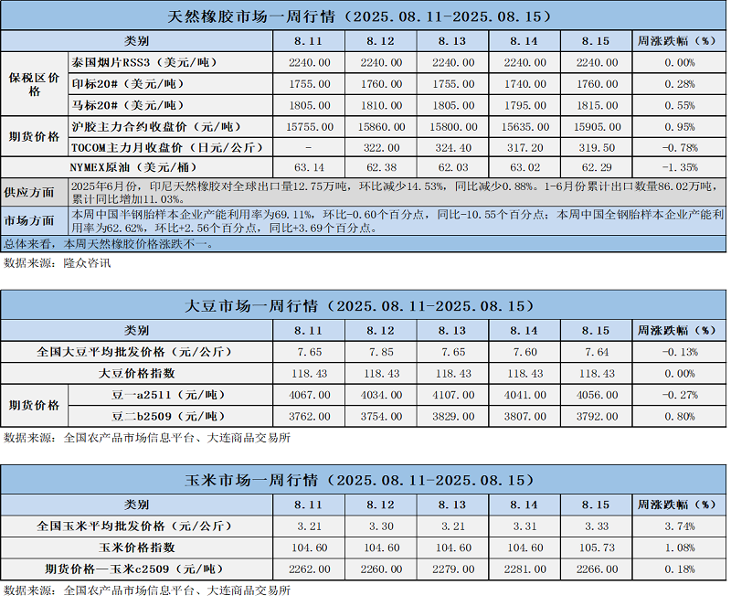 天然橡膠、大豆、玉米市場一周行情(2025.08.11-08.15)