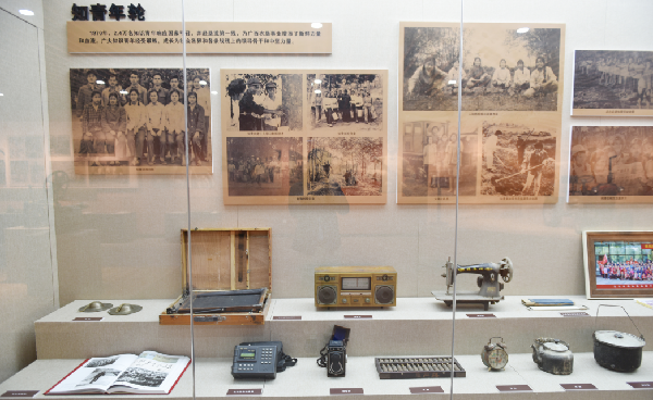 “憶往昔/崢嶸歲月”展廳。主要以廣西農(nóng)墾發(fā)展歷程為主線,展示了廣西農(nóng)墾自1951創(chuàng)建至2015年期間,在種植橡膠、安置歸僑及庫區(qū)移民、社會事業(yè)、體制改革和產(chǎn)業(yè)發(fā)展等方面的崢嶸歷史以及取得的輝煌成就。在新中國成立之初,為了打破美帝國主義對我國的經(jīng)濟(jì)封鎖和禁運(yùn),解決橡膠的生產(chǎn)供應(yīng)問題,黨中央做出“在華南地區(qū)建立天然橡膠生產(chǎn)基地”的重大決策,1951年10月,廣西在省農(nóng)林廳設(shè)立墾殖處,專管廣西的植膠工作,廣西農(nóng)墾由此走上歷史舞臺。這一篇章的“農(nóng)墾大家庭”講述了軍墾、知青、歸僑、移民在農(nóng)墾屯墾戍邊、種植橡膠、發(fā)展生產(chǎn)等艱苦創(chuàng)業(yè)故事?!爱a(chǎn)業(yè)奠基”部分講述了20世紀(jì)60年代,廣西農(nóng)墾除橡膠主業(yè)外,開展多種經(jīng)營,建立了一批豬場、糖廠、水果加工廠等工業(yè)項目,進(jìn)入了農(nóng)墾發(fā)展工業(yè)的初創(chuàng)階段,建立了廣西第一個機(jī)械農(nóng)場、第一個奶牛場、第一家淀粉廠等,還生產(chǎn)出了廣西第一瓶走進(jìn)人民大會堂的礦泉水——“茶花山”礦泉水。“體制創(chuàng)新”部分則講述了十一屆三中全會后,廣西農(nóng)墾通過全面推行農(nóng)工商綜合經(jīng)營,興辦職工家庭農(nóng)場等形式,改變了當(dāng)時農(nóng)場單一經(jīng)營農(nóng)業(yè)格局和企業(yè)統(tǒng)收統(tǒng)支的財務(wù)管理體制,并將墾區(qū)的優(yōu)勢產(chǎn)業(yè)資源進(jìn)行整合,相繼組建了糖業(yè)、畜牧、劍麻等六大產(chǎn)業(yè)集團(tuán),興辦了一批產(chǎn)業(yè)園區(qū),積極向集團(tuán)化、公司化轉(zhuǎn)變,為廣西農(nóng)墾集團(tuán)打造現(xiàn)代一流食品企業(yè)奠定了堅實基礎(chǔ)?!吧鐣?dān)當(dāng)”部分,講述廣西農(nóng)墾承擔(dān)的教育、醫(yī)療衛(wèi)生、人民武裝等社會職能,在保障和改善民生方面做了大量的工作的同時,積極發(fā)揮安邊固疆穩(wěn)定器的作用,在1979年對越自衛(wèi)還擊戰(zhàn)中,邊境農(nóng)場有上萬名民兵支前參戰(zhàn),有21個單位和181人立功獲獎;隨著中央關(guān)于剝離企業(yè)社會職能工作的不斷推進(jìn),除了廣西職業(yè)技術(shù)學(xué)院這所公辦高校被保留至今,其他社會職能都已先后從農(nóng)墾剝離出去。