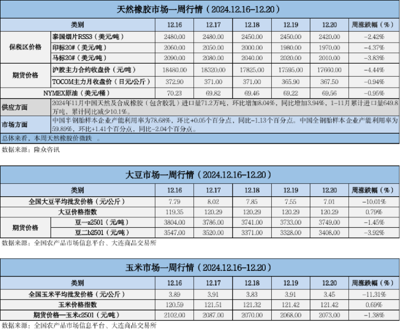 天然橡膠、大豆、玉米市場(chǎng)一周行情(2024.12.16-12.20)