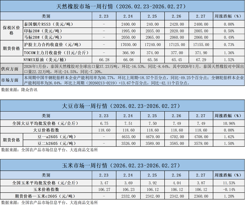 天然橡膠、大豆、玉米市場(chǎng)一周行情(2026.02.23-02.27)