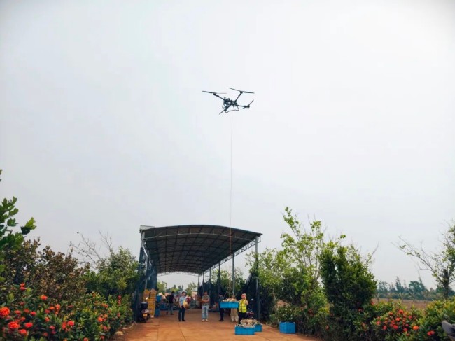 在基地采摘現(xiàn)場,新鮮鳳梨采摘完成后,工作人員將果筐固定于無人機掛鉤,由專業(yè)飛手操控?zé)o人機沿預(yù)設(shè)航線平穩(wěn)飛行,一分鐘內(nèi)即可將鮮果精準(zhǔn)轉(zhuǎn)運至打包棚。據(jù)了解,該無人機作業(yè)半徑達600米,最大載重200斤,每小時運輸量可達3噸,實現(xiàn)田間地頭至打包棚“點對點”直達運輸,大幅縮短轉(zhuǎn)運時間,運輸效率較傳統(tǒng)人工提升2倍以上。相比人工運輸,無人機空中轉(zhuǎn)運優(yōu)勢明顯,人工運輸不僅效率低,還易磨損鳳梨表皮、影響果實品相;而無人機空中作業(yè)不接觸地面,既能保護果園土壤,又可減少果筐顛簸晃動,降低果實損傷,有效保障果品品質(zhì),又可降低生產(chǎn)成本。