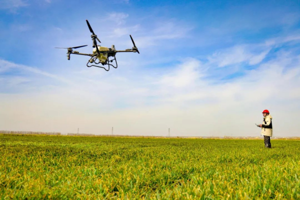 蘇墾農(nóng)發(fā)新洋分公司利用新型植保無(wú)人機(jī)為小麥噴施葉面肥。張偉生攝
