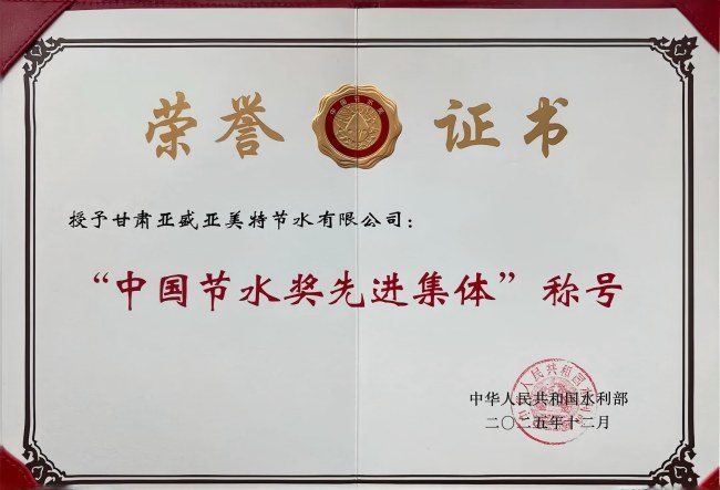 12月26日,首屆中國節(jié)水獎(jiǎng)?lì)C獎(jiǎng)會(huì)在北京召開,亞盛亞美特公司榮獲“中國節(jié)水獎(jiǎng)先進(jìn)集體”稱號。該獎(jiǎng)項(xiàng)是經(jīng)黨和國家功勛榮譽(yù)表彰工作委員會(huì)批準(zhǔn)設(shè)立、由水利部主辦的節(jié)水領(lǐng)域最高獎(jiǎng)項(xiàng)。