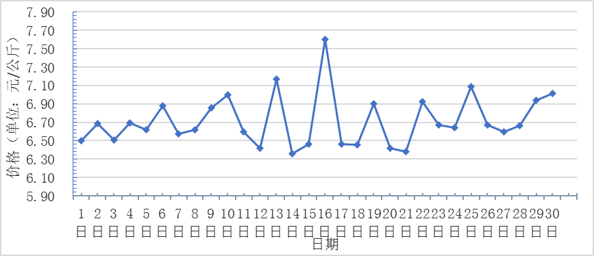 9月,全國重點監(jiān)測農(nóng)產(chǎn)品批發(fā)市場香蕉總交易量達2.1萬噸,同比下降16.0%,環(huán)比下降38.2%;總交易價值13722.9萬元,同比下降14.8%,環(huán)比下降34.3%。日平均價格最高為7.6元/千克,最低為6.4元/千克,全月平均價格為 6.7元/千克,同比上漲6.3%,環(huán)比上漲4.7%(每日價格變化如圖)。
