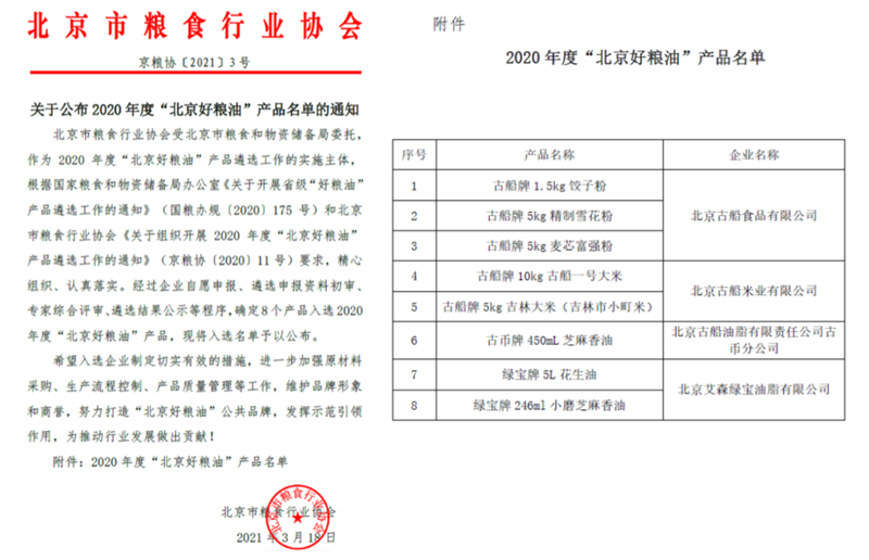 4月11日,由北京市糧食行業(yè)協(xié)會(huì)(簡(jiǎn)稱“北京糧協(xié)”)制定的《“北京好糧油”產(chǎn)品遴選及管理辦法》(簡(jiǎn)稱“《辦法》”)發(fā)布,首批“北京好糧油”產(chǎn)品同步向社會(huì)進(jìn)行公布。集團(tuán)旗下“古船、古幣、綠寶”4家單位的8個(gè)單品,包攬首批“北京好糧油”產(chǎn)品名錄。
