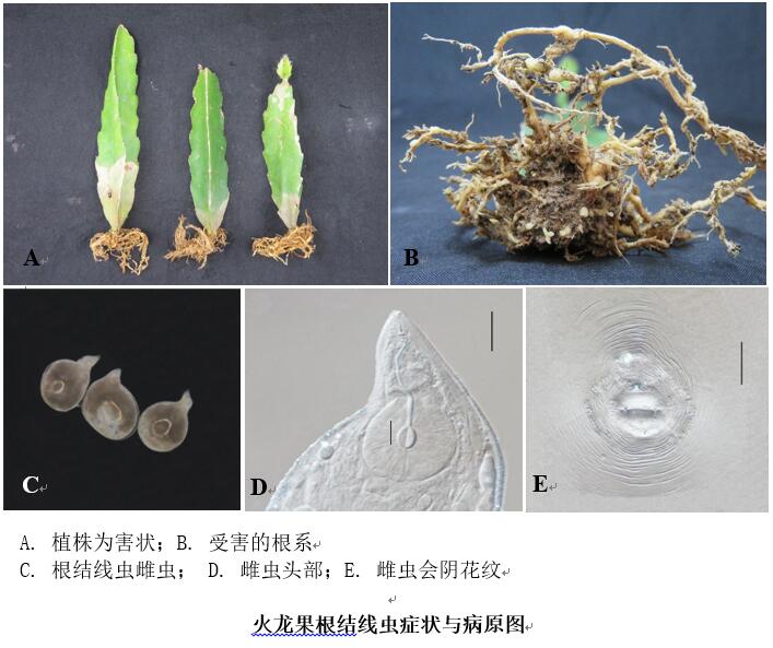 近期,病蟲害防控項(xiàng)目組專家在福建省漳州與泉州火龍果種植區(qū)調(diào)查發(fā)現(xiàn)根結(jié)線蟲為害火龍果。為害前期,植株地上部癥狀不明顯,受害嚴(yán)重時(shí),地上部枝條生長(zhǎng)緩慢,表皮由深綠色轉(zhuǎn)為黃綠色,莖肉縮水變扁,植株呈凋萎狀,受害根部??梢姶笮〔灰坏母Y(jié),新根少;發(fā)病后期根系變褐、腐爛。鏡檢解剖根部可見乳白色或淺黃色的雌蟲寄生于根內(nèi),根外肉眼可見根結(jié)線蟲膠質(zhì)狀的卵囊。經(jīng)分離與鑒定,確定為害閩南火龍果根結(jié)線蟲的種為南方根結(jié)線蟲(Meloidogyne incongnita)和象耳豆根結(jié)線蟲(M. enterolobii)。其中,象耳豆根結(jié)線蟲是目前生產(chǎn)上重要病原線蟲,其寄主范圍廣、致病性強(qiáng),近年來已在閩南地區(qū)多種作物和果樹上發(fā)現(xiàn)為害,應(yīng)引起足夠重視,防止傳播擴(kuò)散。因此,各監(jiān)測(cè)站和生產(chǎn)部門應(yīng)引起重視,指導(dǎo)果農(nóng)及時(shí)開展防治。項(xiàng)目組專家提出如下防控建議。