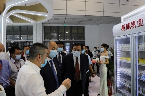 農(nóng)業(yè)農(nóng)村部副部長(zhǎng)馬有祥(前排中)、山東省副省長(zhǎng)江成(前排右)參觀燕塘乳業(yè)展區(qū)