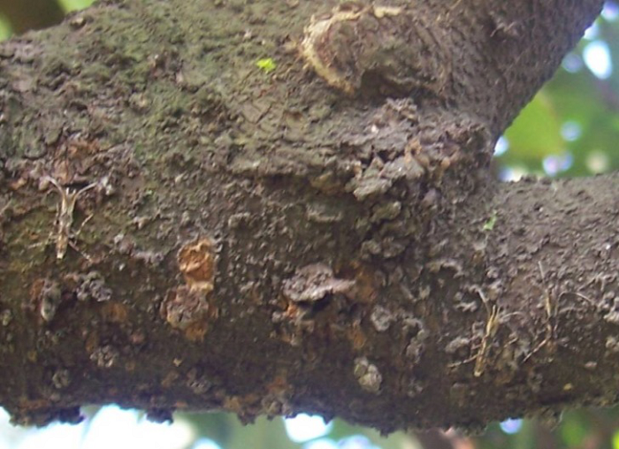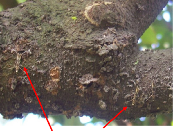 三、檢查藥效,及時進行補藥噴殺。根據(jù)成蟲白天棲于陰涼的樹冠內膛枝桿上(如下右圖),受到驚嚇時會飛離枝桿這一特性,可每天清晨到果園進行實地調查,對荔枝內膛的枝桿進行拍打(如下左圖),如發(fā)現(xiàn)還有成蟲飛出,2天后再次噴藥。