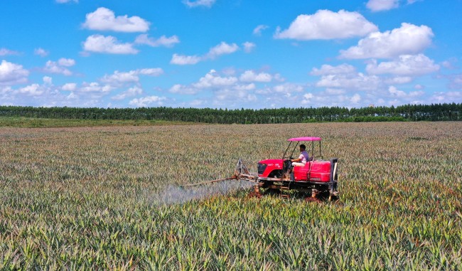 綠色種養(yǎng),守護(hù)產(chǎn)業(yè)可持續(xù)發(fā)展底色。綠色種植優(yōu)生態(tài),精準(zhǔn)管護(hù)提品質(zhì)。農(nóng)場(chǎng)以科技興農(nóng)為抓手,組建黨員技術(shù)攻關(guān)小組,聚焦菠蘿種植關(guān)鍵環(huán)節(jié)優(yōu)化服務(wù)模式,大力推進(jìn)機(jī)械化與數(shù)字化融合,引進(jìn)新型菠蘿種植機(jī)、北斗導(dǎo)航系統(tǒng)、植保無人機(jī)等設(shè)備,以科技賦能升級(jí)貼身經(jīng)營(yíng)質(zhì)效,推動(dòng)菠蘿種植向高效綠色方向轉(zhuǎn)型。黨員技術(shù)團(tuán)隊(duì)牽頭搭建水肥一體化灌溉系統(tǒng)、機(jī)械化施有機(jī)肥、套袋護(hù)果等田間管護(hù)服務(wù)鏈條,根據(jù)菠蘿生長(zhǎng)周期精準(zhǔn)調(diào)配水肥,實(shí)現(xiàn)每畝節(jié)水20%、節(jié)肥30%,為產(chǎn)業(yè)可持續(xù)發(fā)展筑牢綠色根基。