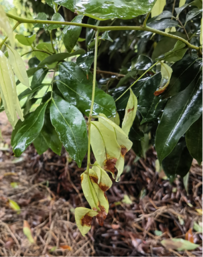 當前我國荔枝主產(chǎn)區(qū)除海南外,廣東、廣西以及福建的荔枝中晚熟品種由南往北陸續(xù)進入盛花期。荔枝花穗易感霜疫病,連續(xù)陰天多雨則發(fā)生流行,導致大量小花甚至整個花穗腐爛。近期,荔枝病蟲害監(jiān)測與防控專家分別對粵西、粵東和珠三角地區(qū)部分荔枝果園表層土壤進行了荔枝霜疫霉誘導和檢測,帶菌率超過95%,表明病原菌基數(shù)處于高位;前段陰雨潮濕,土壤中的荔枝霜疫霉已傳播到貼近地面的嫩葉并導致發(fā)?。▓D1),個別果園的花穗也發(fā)現(xiàn)了霜疫?。灰坏├笾λ呙箓鞑サ綐渖?,在陰雨高濕天氣條件下將會快速蔓延。據(jù)中國天氣網(wǎng)30日天氣形勢預報:未來10天南方地區(qū)多陰雨天氣,降水量10~40毫米,部分地區(qū)50~90毫米,降水量較常年同期偏多。因此,荔枝病蟲害監(jiān)測與防控專家建議廣東、廣西、福建等荔枝主產(chǎn)區(qū)農(nóng)業(yè)農(nóng)村主管部門及農(nóng)業(yè)技術(shù)推廣機構(gòu)積極開展荔枝霜疫病監(jiān)測,指導果農(nóng)及時開展有效防控。