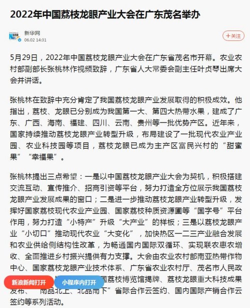 1.2022年5月,熱作發(fā)展處在廣東茂名成功舉辦2022年中國(guó)荔枝龍眼產(chǎn)業(yè)大會(huì),大會(huì)發(fā)布了《中國(guó)·茂名荔枝產(chǎn)業(yè)發(fā)展白皮書(2022)》、荔枝龍眼重大科技成果等,有效帶動(dòng)荔枝龍眼產(chǎn)業(yè)發(fā)展,獲農(nóng)業(yè)農(nóng)村部張?zhí)伊指辈块L(zhǎng)、廣東省委常委王瑞軍的肯定性批示,有關(guān)情況被人民網(wǎng)、新華網(wǎng)等中央主流媒體報(bào)道。