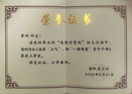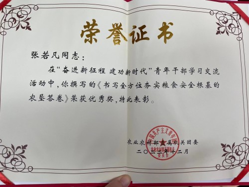 5.郭靜如同志獲農(nóng)業(yè)農(nóng)村部系統(tǒng)黨章黨規(guī)黨紀(jì)知識(shí)競(jìng)賽黨員干部組三等獎(jiǎng);季剛同志獲旗幟雜志“我想對(duì)黨說(shuō)”征文活動(dòng)三等獎(jiǎng);張若凡同志獲農(nóng)業(yè)農(nóng)村部直屬機(jī)關(guān)團(tuán)委“奮進(jìn)新征程 建功新時(shí)代”青年干部學(xué)習(xí)交流活動(dòng)優(yōu)秀獎(jiǎng)。