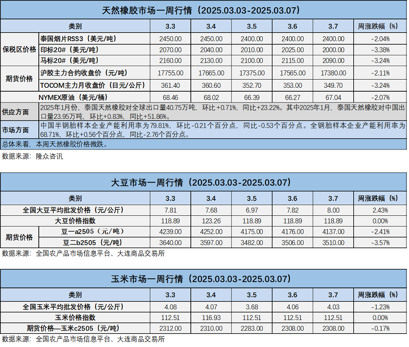 天然橡膠、大豆、玉米市場一周行情(2025.03.03-03.07)