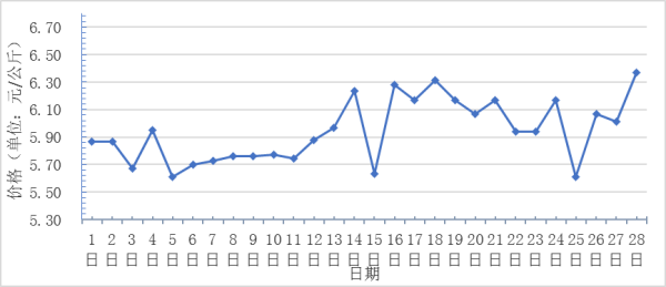 2月,全國重點監(jiān)測農(nóng)產(chǎn)品批發(fā)市場香蕉總交易量達1.7萬噸,同比下降10.5%,環(huán)比下降19.5%;總交易價值9835.9萬元,同比下降1.3%,環(huán)比下降11.2%。日平均價格最高為6.4元/千克,最低為5.6元/千克,全月平均價格為5.9元/千克,同比上漲11.3%,環(huán)比上漲7.2%(每日價格變化如圖)。